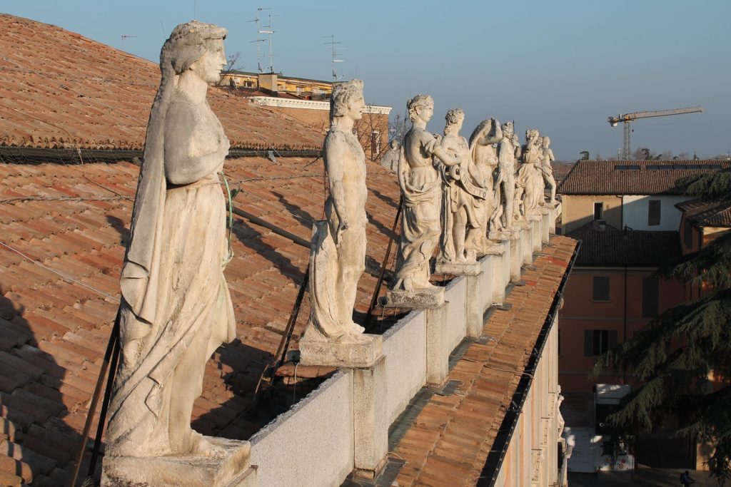 Un primo passo per riportare all’antico splendore Vizio, Gloria, Danza, Estro e Pudore, le cinque statue del Teatro Municipale Romolo Valli. In questi giorni grazie ad AerariumChain è stata completata la scansione 3D delle statue che svettano sul tetto del Teatro, un patrimonio artistico che richiede un’adeguata tutela a causa del progressivo deterioramento dovuto alla fragilità dei materiali e all’esposizione agli agenti atmosferici. Le statue sono ad oggi avvolte in una rete di nylon e sostenute da un ponteggio, al fine di prevenire eventuali cadute.