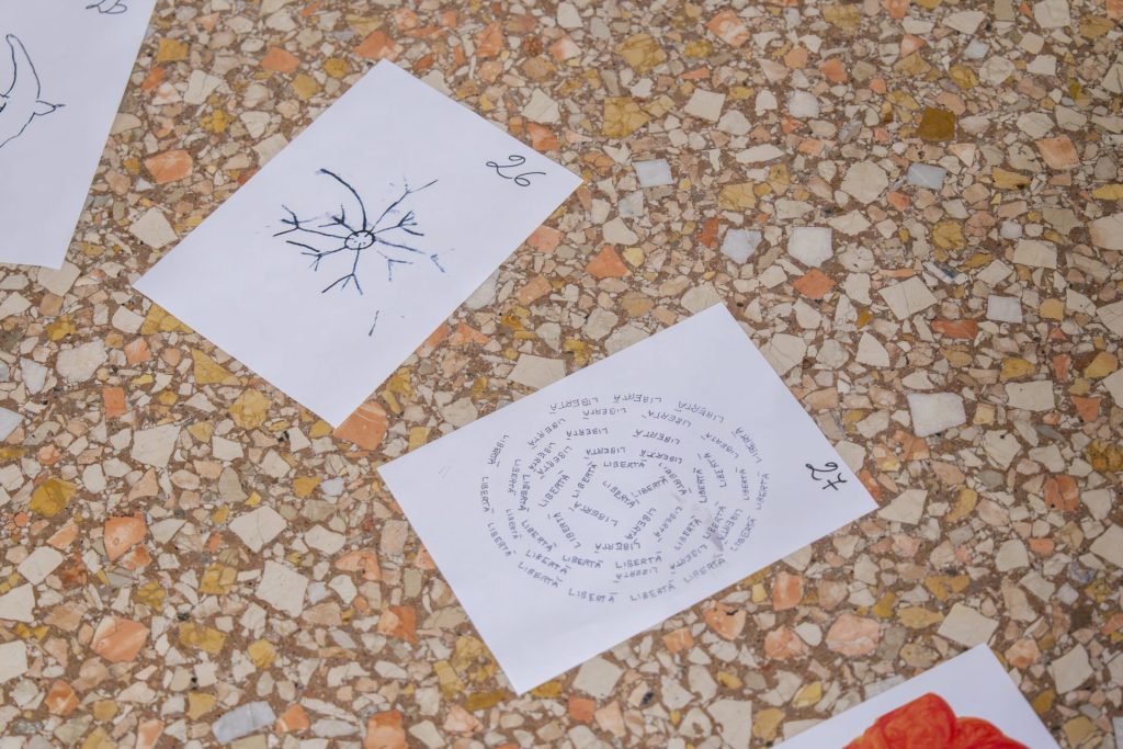 Una volta stampati, questi pezzi sono arrivati nella Sartoria di K-Lab, dove persone provenienti da percorsi di fragilità hanno aggiunto un segno speciale: un filo rosso che completa frasi e disegni, legando insieme storie e sensibilità.