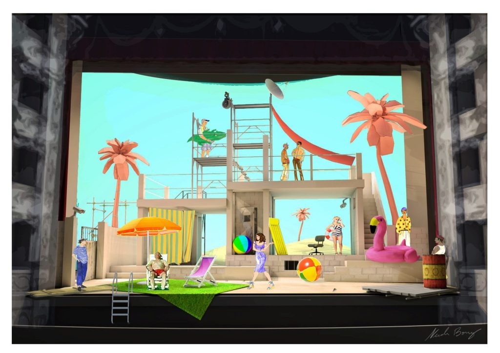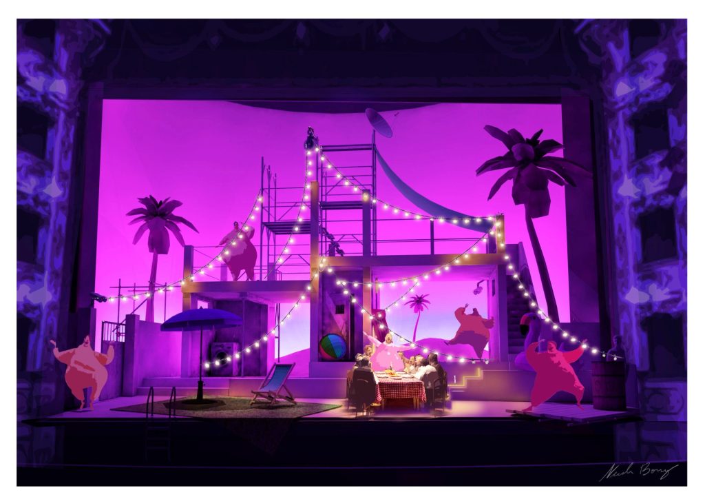 «L’ambientazione contemporanea non cerca il realismo, ma un terreno instabile su cui far precipitare l’azione. La villa incompiuta diventa un contenitore anarchico di oggetti eterogenei: materiali da cantiere convivono con arredi domestici, sedie da ufficio diventano troni, carriole si trasformano in mezzi di trasporto o piedistalli cerimoniali. È uno spazio che i personaggi abitano con assoluta naturalezza, come se fosse sempre stato così. Ed è proprio questo scarto – tra il caos che lo spettatore osserva e la disinvoltura con cui i personaggi lo attraversano – a produrre la comicità».