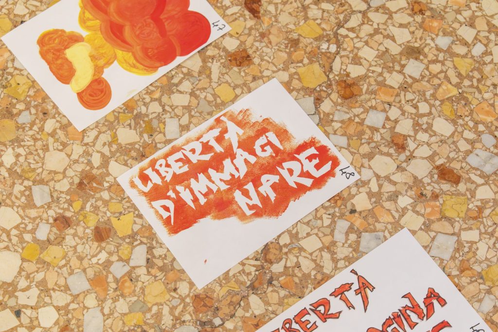 T-shirt e shopper, una volta stampate, sono state lavorate dalla Sartoria di K-Lab – che coinvolge persone provenienti da percorsi di fragilità in esperienze professionali e inclusive – con l’inserimento di un filo rosso che completa e arricchisce queste frasi e immagini nate dai pensieri – sempre profondi e sorprendenti.
